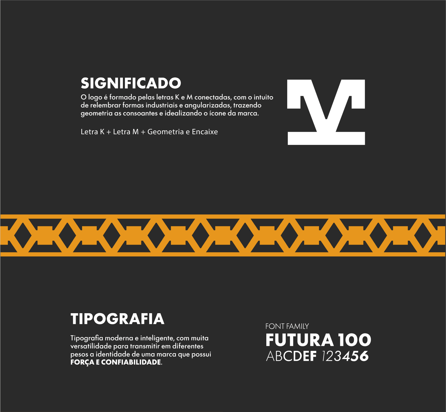 O símbolo central nasce da fusão das iniciais K + M, formando um ícone geométrico e robusto que remete a encaixe mecânico, precisão e força estrutural. A paleta laranja e preto reforça energia e autoridade, enquanto a tipografia firme garante presença e memorização em qualquer escala — da fachada à aplicação digital.